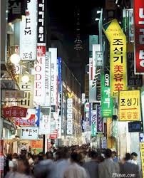 De noite fui conhecer uma espécie de 25 de março de Seoul. Mistura de 25 de março com Las Vegas na verdade, tamanha a quantidade de letreiros luminosos no local. Isso foi logo após jantarmos num japonês esquisitíssimo. Para ir do prédio onde estávamos até este restaurante passamos por dentro da estação Seoul (a principal daqui). É uma estação enorme que liga prédio comercial + shopping+ várias quadras.